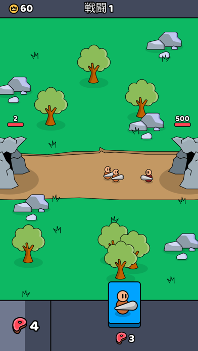 バトルでは負けても倒した敵の数に応じてコインを獲得。コインではユニットのコストであるお肉の生産速度を上げたり、拠点のライフを上げたりできます。