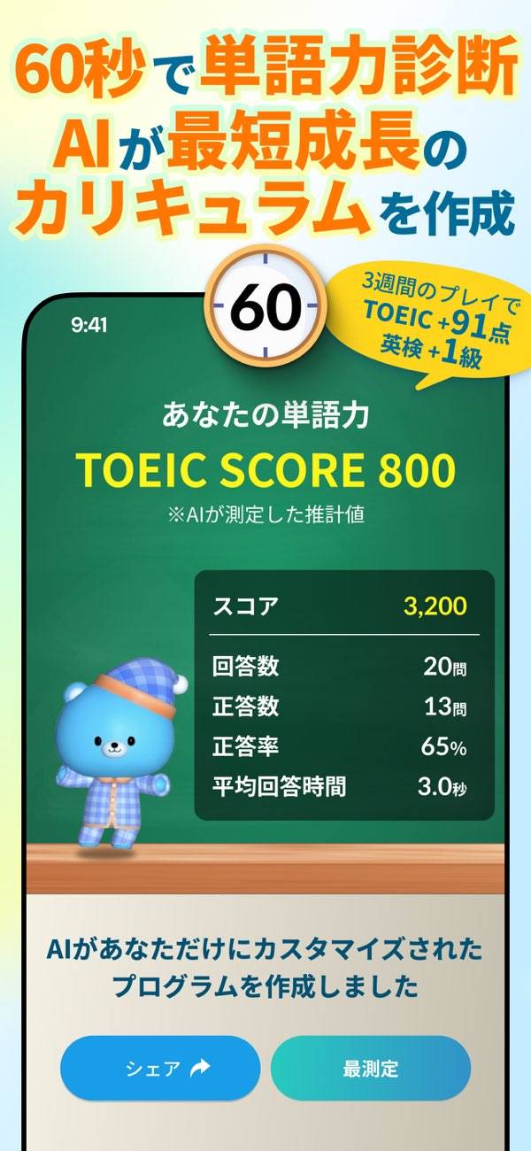 設定した年代に応じて、偏差値が計算されます。ゲームで遊んだ結果から自分の正誤率、スコア、習得単語数を表示。学習記録が数字として残るので、日々の成長を感じられると同時に、学習のモチベーションアップにつながります。