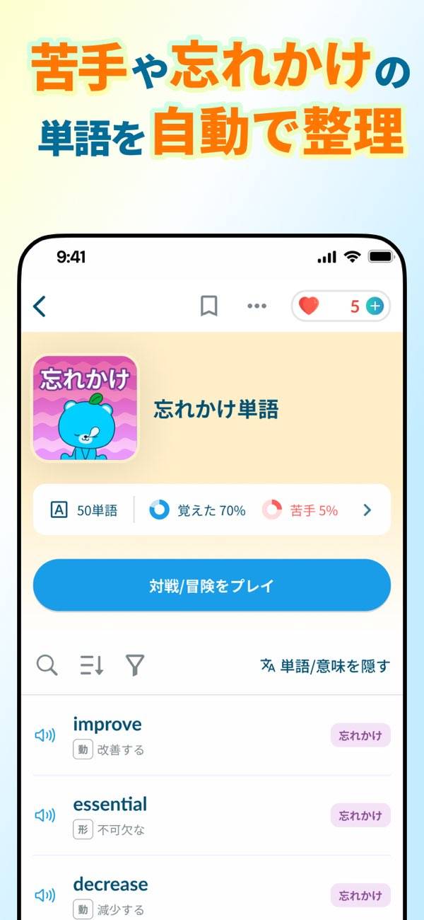 英単語の暗記が大の苦手だったけど、このアプリを使い始めてから劇的に変わりました!降ってくる英単語に対応する和訳をタップして撃破するシステムで、夢中になってプレイしてしまいます。単語帳での暗記は15分も続かなかったのに、このアプリなら1時間でもできるから驚き。高校受験からTOEICまで幅広いレベルに対応しているので、今後も長く使えそうです。楽しみながら英語力を向上させたい学生には本当におすすめのアプリです!!