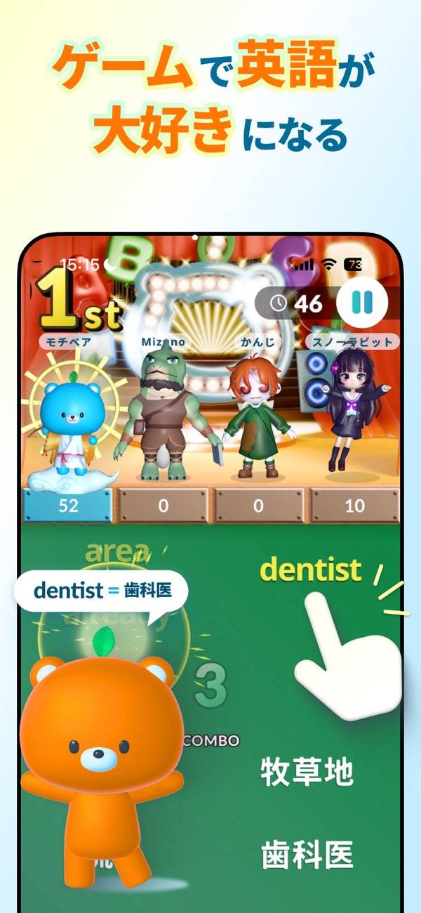 落ちてくる英単語の和訳をタップして、ほかユーザーよりもスコアを稼ぐゲーム形式。どんどんと英単語が落ちてくるので、正しい和訳を素早く選択するのがポイント。ほかユーザーに負けたくない競争心が何度も挑戦させ、気がつけば英単語を覚えているという好循環に。