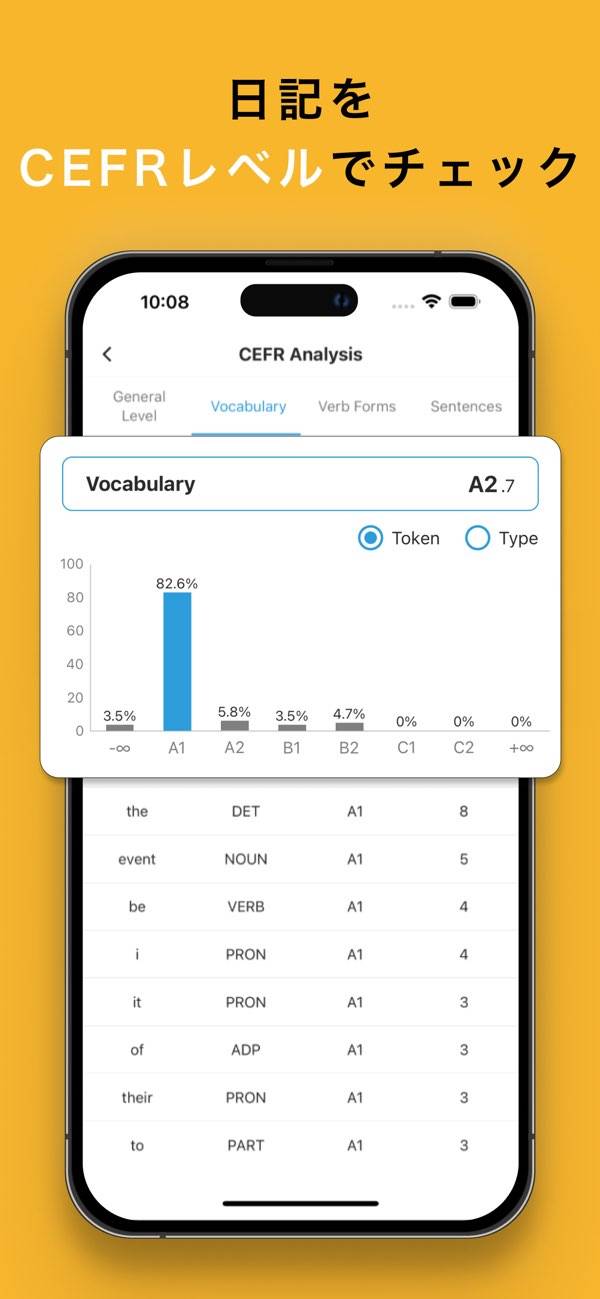 A1,A2,B1,B2,C1,C2(CEFR)の6段階でチェック。使っている単語や文法のレベルの情報も提供します。