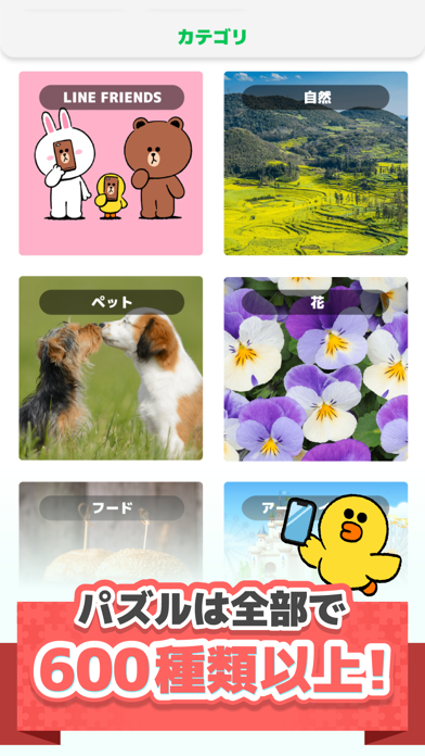 LINEのキャラクターや風景の描かれたパズルに挑戦できます。パズルをクリアすると、クリア報酬+ボーナスコインを獲得。100コインでポイガチャチケット1枚と交換が可能です。