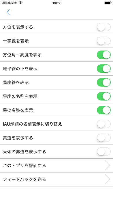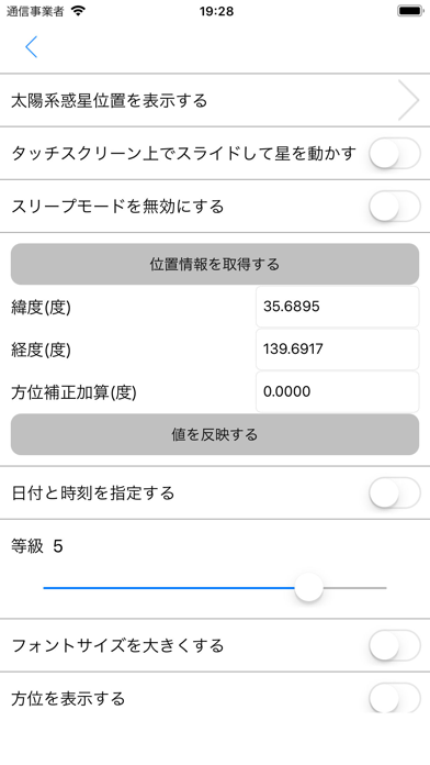 設定画面では太陽系惑星の位置や、月の満ち欠けの表示を切り替えられます。ほかにもフォントサイズを大きくしたり、方位や十字線の表示をオン・オフにしたりと幅広い設定が可能。自分が見やすい画面にカスタマイズしてください。