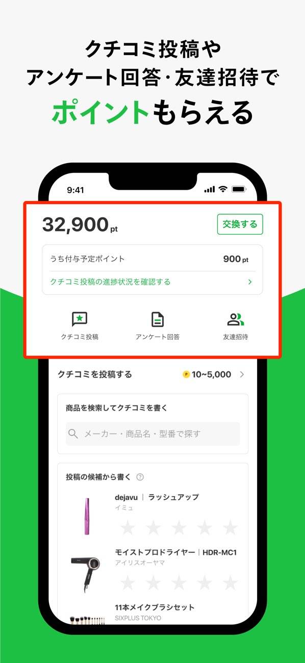 ポイント(pt)はクチコミ投稿やアンケートへの回答、友達招待を通じ獲得可能。
