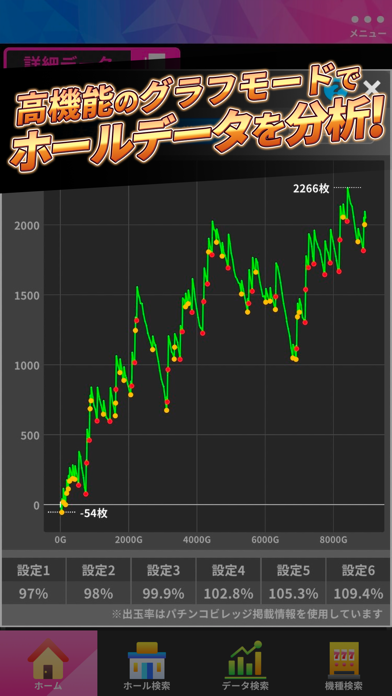 より快適なプレイ環境や実店舗での勝率向上を目指す方は、課金を検討しましょう。倍速プレイや設定変更機能で効率的に楽しめるだけでなく、全国の出玉データのチェックがよりしやすくなります。ホール検索やグラフ表示、過去データのチェックなど、実店舗での立ち回りにも活用可能。