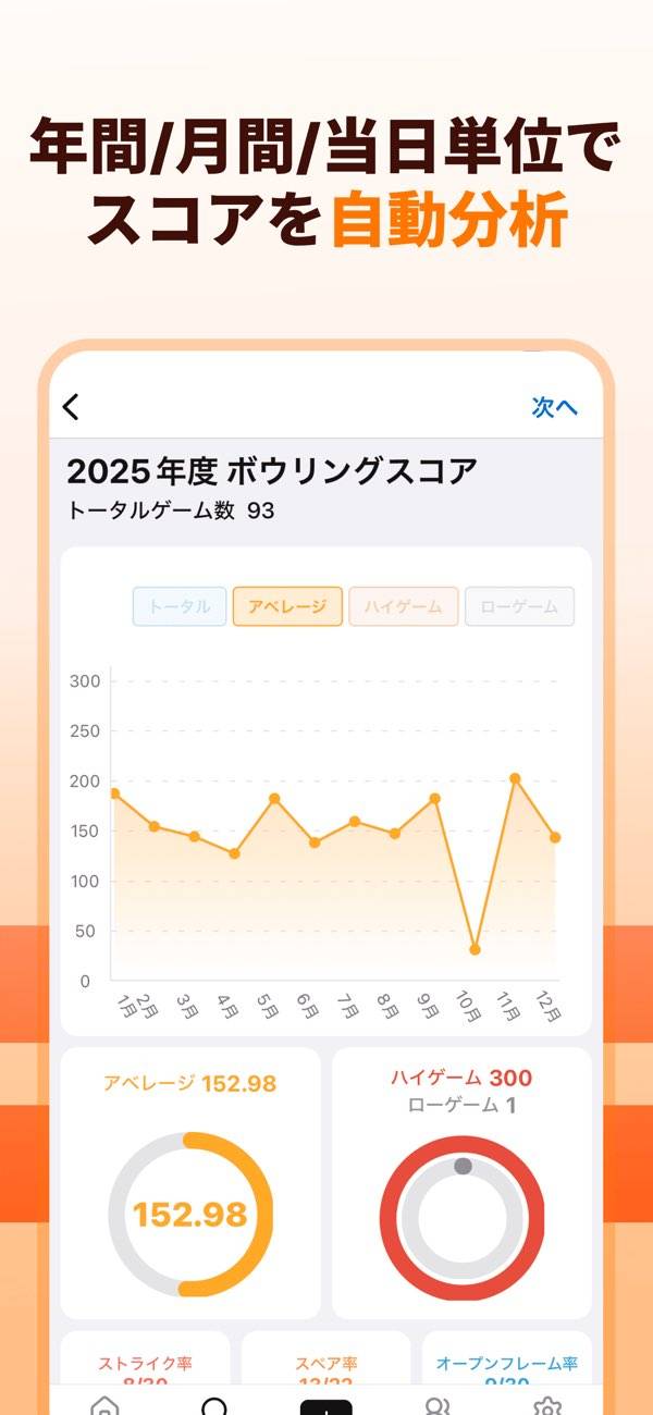 年間通じてボウリングの最高スコアはいくら? ストライク率も算出してくれる