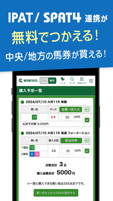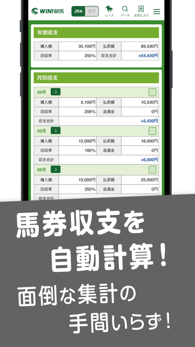 - IPTAと連携で馬券が買える。収支計算機能もあり便利