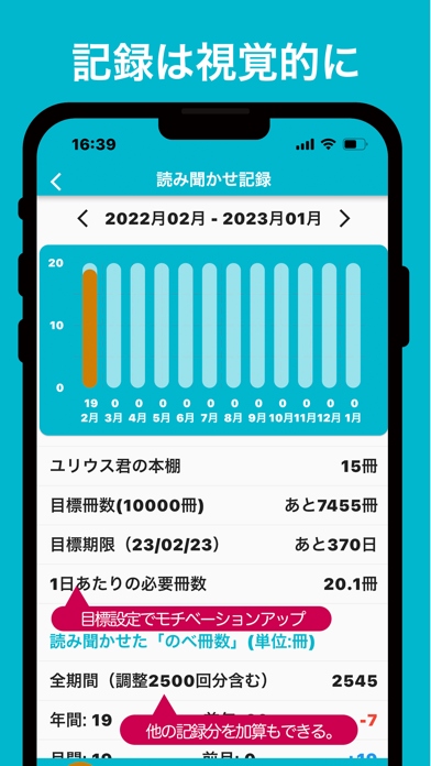 どれだけ絵本を読み聞かせられたか、月間や年間の記録が見られます。「この月は忙しくてあんまり読んであげられなかったな」と意識できるのも、親御さんにはうれしいところ。子供にいっぱい絵本を読んでほしい人は、こまめにチェックしておくといいでしょう。