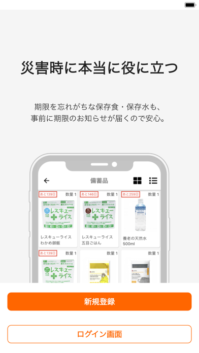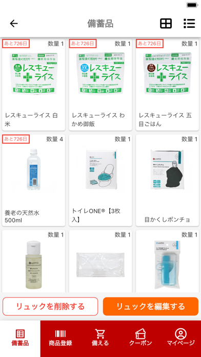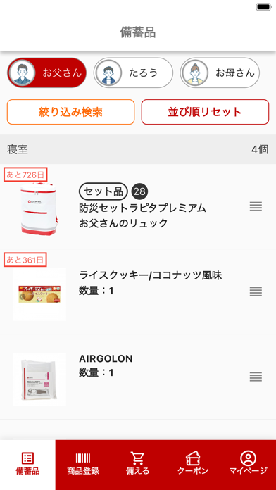 購入してある備蓄品を登録することで、一括で管理できるようになります。家には何を用意してあって、何が無いのかといった確認に便利です。