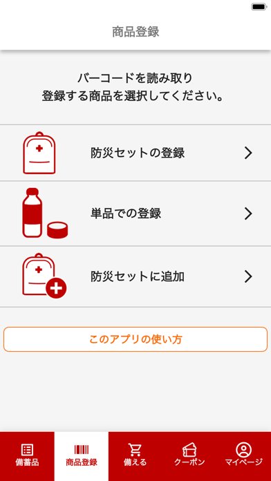 - 商品は災害セットだけでなくバーコードによる単品での登録も可能