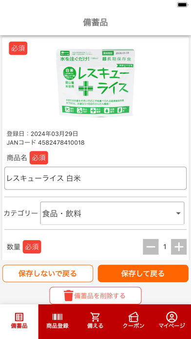 バーコードを読み取れば、防災備蓄品として商品が登録されているものは自動で情報が入力されます。備蓄向きの商品でなくとも、自分で写真やカテゴリーを設定すれば、どんな商品でも登録可能です。