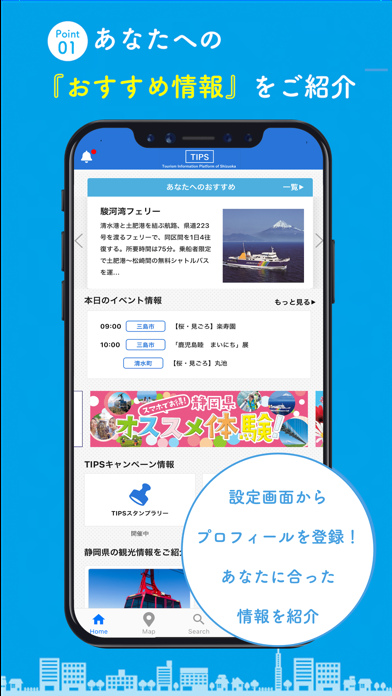 静岡県の観光スポットやイベント情報が掲載されています。ホーム画面では「あなたへのおすすめ」や最新のイベント情報を掲載。期間限定のイルミネーションや、アニメコラボのスタンプラリーなど、幅広い内容が見られます。