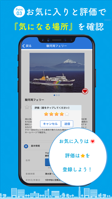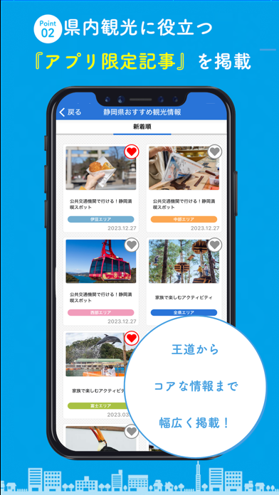 静岡県のおすすめ観光スポットを紹介しているアプリ。西部・中部・富士・伊豆の4つのエリアごとに、イベント情報や観光案内のページを掲載しています。