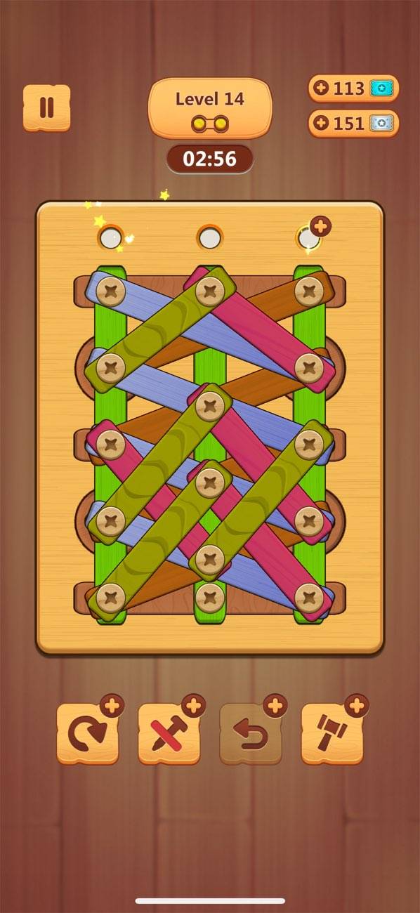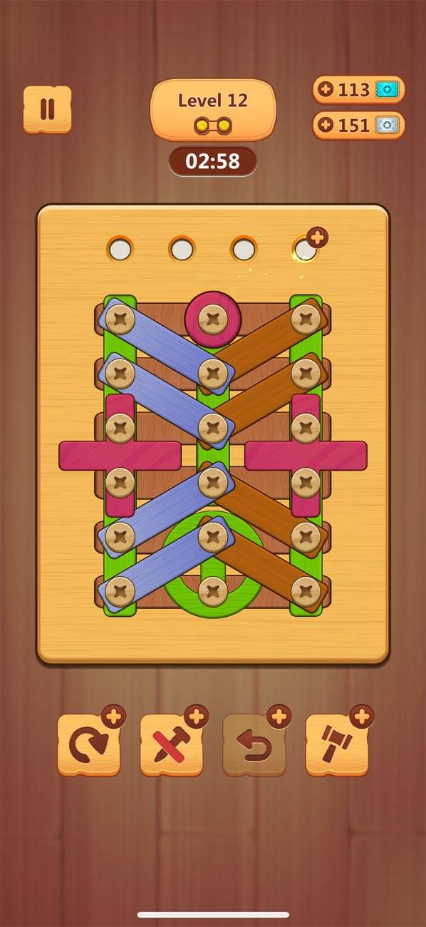 木に取り付けられたネジを動かして、すべての木からネジを外すパズルゲーム。どのネジから動かしていけば木が外れるのか、手順を考えていくタイプのパズルです。