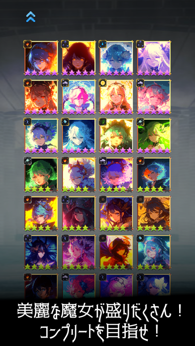 多数の魔女イラストが集められるガチャゲームアプリ。無料または広告視聴で10連ガチャが引き放題で、ランダムに星2~星5の魔女が手に入ります。192種のコンプリートを目指しましょう。