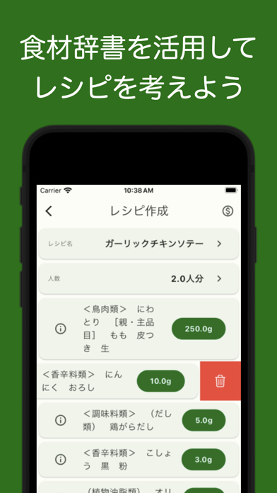 - 食材を選択してレシピを登録。量などを自由に調整できる