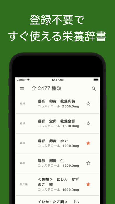辞書から2,477種類の食品成分表が見られます。多数の食品データからよく食べる食材を選んで、お気に入り登録することが可能。レシピを入力するときに食材が選びやすくなります。
