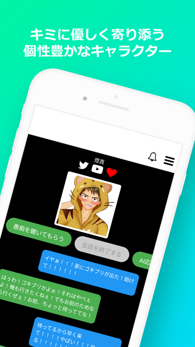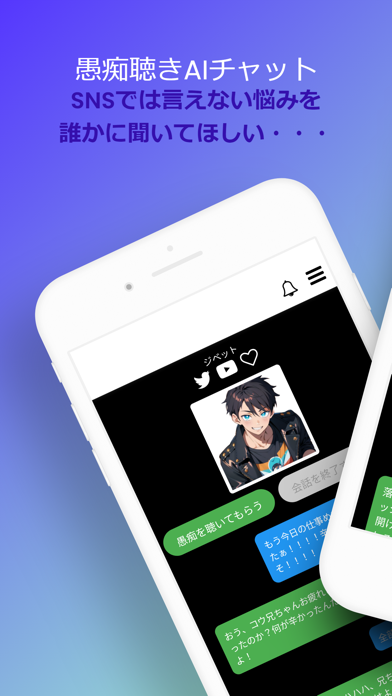 愚痴や悩み事を相談すると、AIが答えてくれるチャットアプリ。ただのAIではなく、男声・女声の音声付きで、イケメン・美少女キャラクター、VTuberなどをモデルにした口調で答えてくれます。