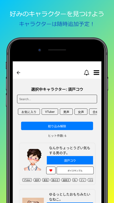 アプリ内には10名のキャラが存在しており、中にはボイスサンプルが聞けるものも。特に男性キャラが多く、女性相手に向けた内容を話してくれます。あなた好みのキャラを設定して、愚痴を聞いてもらいましょう。