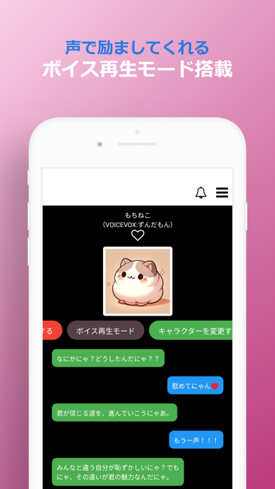 愚痴を書き込んで送信すると、全肯定で受け止めてくれる心強いAIチャット。会話の始まりと終わり、あいづちのときには音声が流れるので、まるで本当にキャラと話しているような気持ちになれます。落ち込んだときは元気づけてもらってはいかがでしょう。