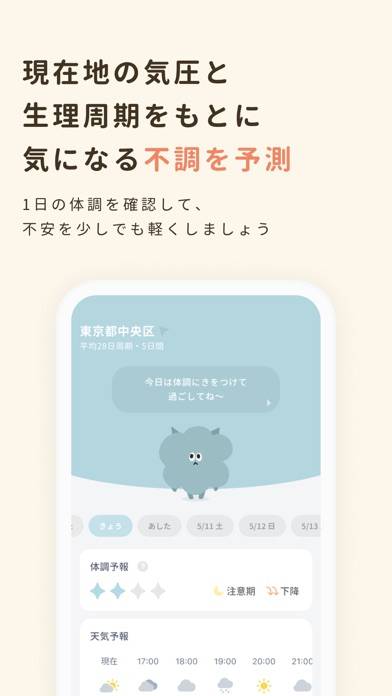 ホーム画面には自分の体調に合わせたかわいいキャラクターがいます。体調不良のときに開きがちなので、アプリ全体的に落ち着いた色やフォントなのも嬉しいポイントです。