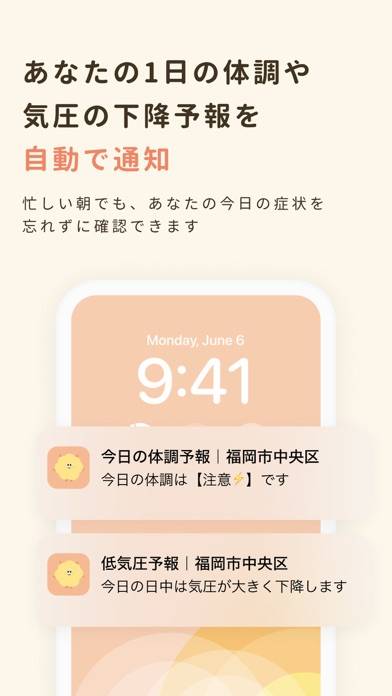 かわいらしく描かれたイラストで、気圧の影響度を教えてくれます。気分と頭痛が警戒モードになっているときは、湯船に入るなどセルフケアを行うといいでしょう。また、気圧以外にも気象タイムラインがチェックできます。