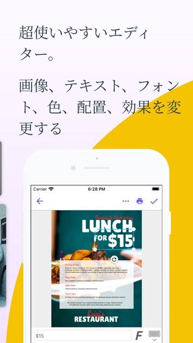 デザイン未経験者でも目を引くメニューを作成できるアプリ。多彩なスタイルのテンプレートが無料で利用可能で、専門店のような仕上がりです。自分のセンスでカスタマイズも行え、完成品はウォーターマークなしで共有や印刷が可能。プロモーションを手軽に強化できます。