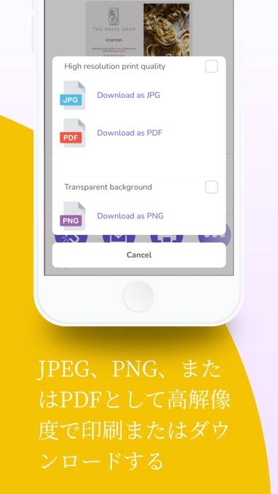 完成したメニュー表は、SNSやメールでの共有が可能。ウォーターマークのない状態でJPEG、PNG、PDF形式に無料でダウンロードできるので、プロモーション資料としても活用できます。また追加費用なしでデザインを自由に使用できます。