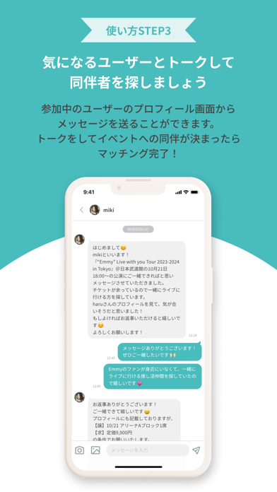 イベントの参加登録やマッチング機能を利用するには、課金が必要。月額のプレミアム会員になることで、音楽仲間を探せるようになります。トーク機能で日程合わせやチケットの譲り合いのやり取りができ、便利に使えます。