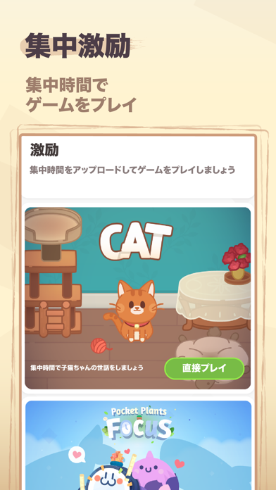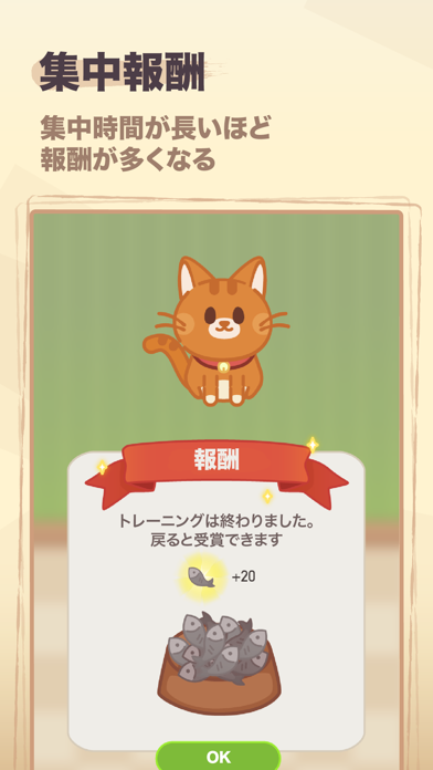 - 猫のお世話ができるミニゲームがあり、集中時間に応じて報酬ゲット