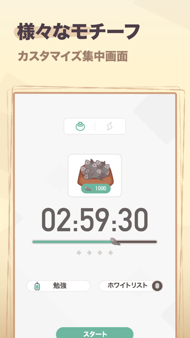 設定したタイマーの時間だけ、勉強・作業に取り組めるスマホ使用制限アプリ。集中できた時間だけ、アプリ内のミニゲームで使えるアイテムが報酬として手に入るユニークなシステム。ミニゲームではかわいい猫のお世話ができ、勉強・作業の休憩時間を癒やしに。