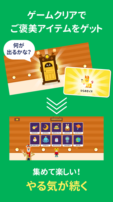 - 形のパズルや算数の問題を解いて、しまじろうたちと楽しく勉強できる