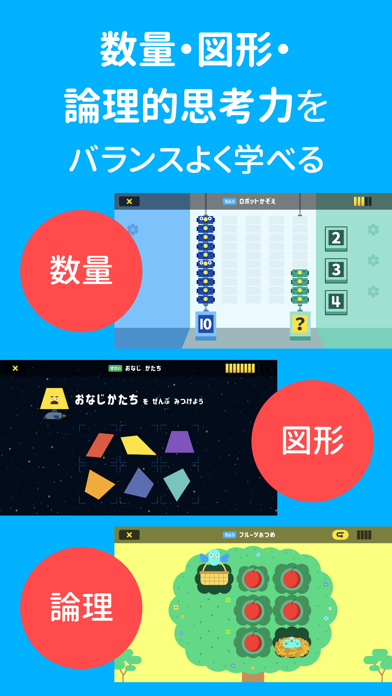 算数やパズルのステージに挑戦していく知育アプリ。しまじろうの仲間たちと一緒にひらめきパワーを集めるため、いろんな問題を解く冒険に出ます。幼児~小学2年生に対応した問題が用意されているので、楽しく算数を覚えさせたい親御さんにおすすめです。