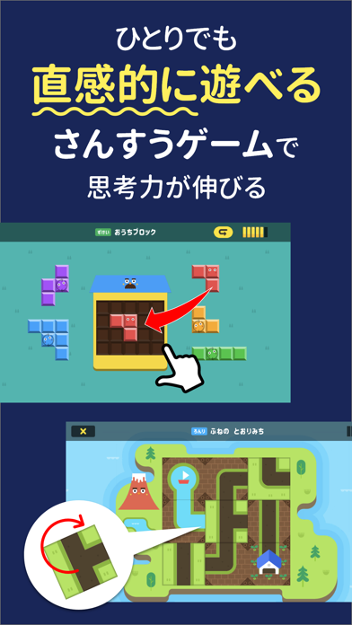 算数やパズルのステージに挑戦していく知育アプリ。しまじろうの仲間たちと一緒にひらめきパワーを集めるため、いろんな問題を解く冒険に出ます。幼児~小学2年生に対応した問題が用意されているので、楽しく算数を覚えさせたい親御さんにおすすめです。