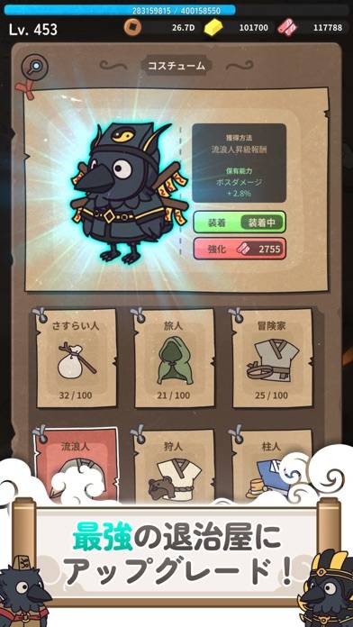 カラスの姿をした妖怪退治屋、カブリ君が戦う放置RPGです。強化要素が多く育てがいのあるシステムが特徴。特に「術式」がユニークで、属性ごとの強力な技を少しずつ習得していく楽しみがあります。