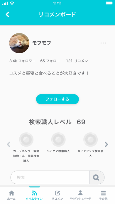 ネットでの商品検索が上手い「リコメン職人」のユーザーをフォロー。フォローしているリコメン職人たちが紹介するサイトを、タイムライン形式で見られます。気になる商品ジャンルのリコメン職人を、ランキングなどから見つけておくのがおすすめです。