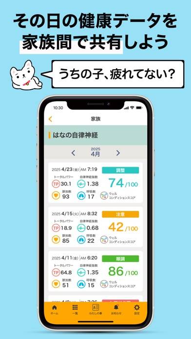 スマホで自律神経や疲労度を計測し、家族やペットの健康状態を管理できるアプリです。健診結果や診療記録もまとめてチェックできるうえ、病気のリスクも予測してくれます。