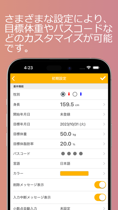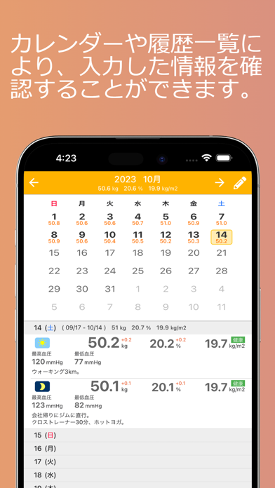 - 体重や体脂肪率などの記録をしていける体重・体調管理アプリ