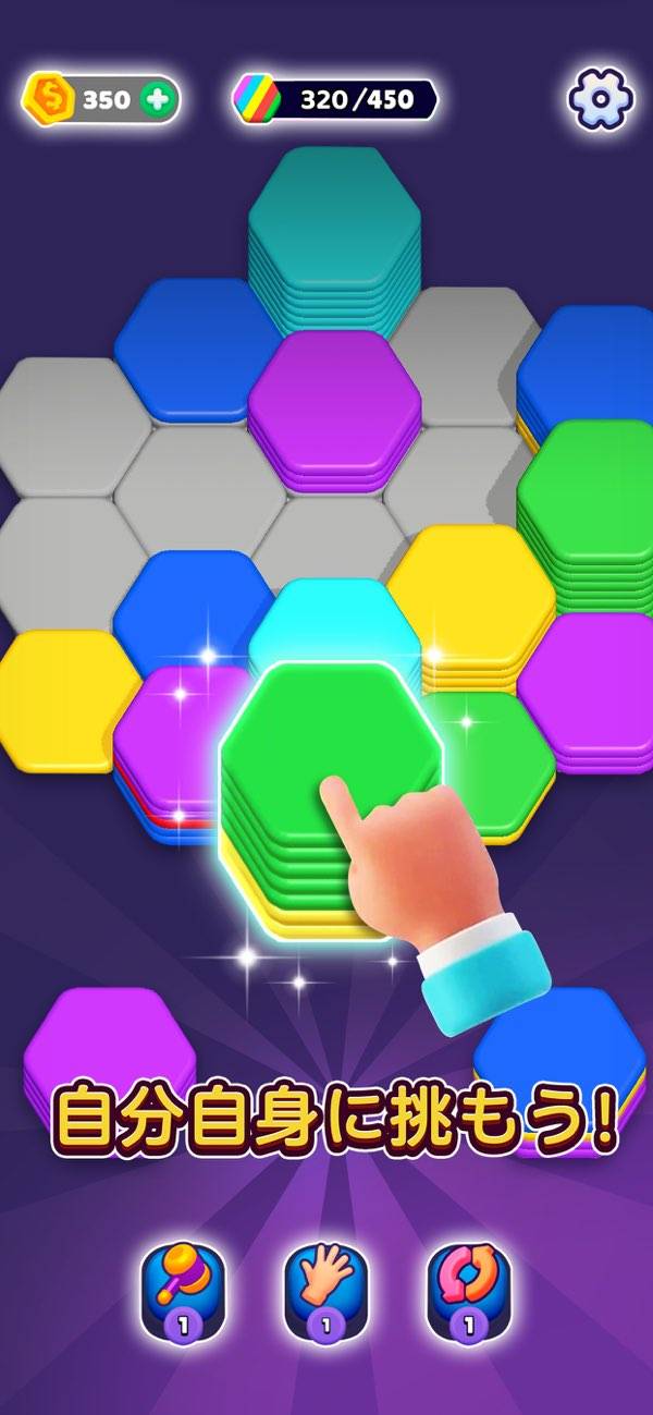 ヘキサゴンを置いていき、一定数集めていくパズル。画面上のゲージが満タンになるとクリアです。パタパタとリズムよくヘキサゴンが動く様子がおもしろく、つい長時間プレイしてしまいます。