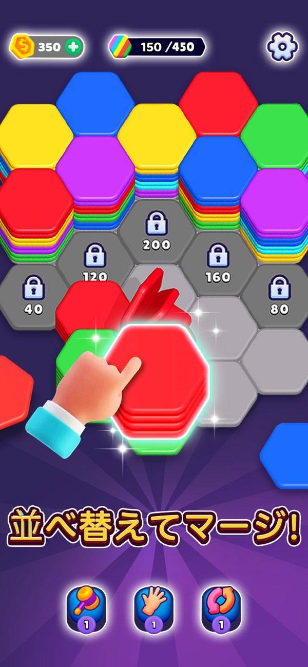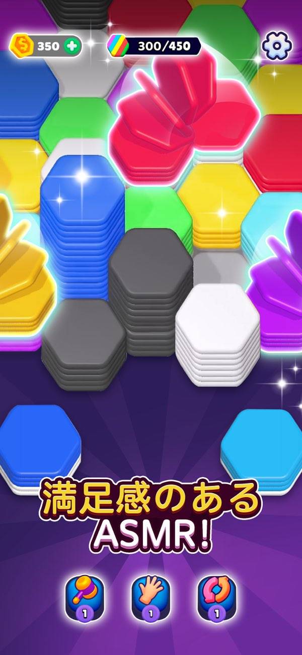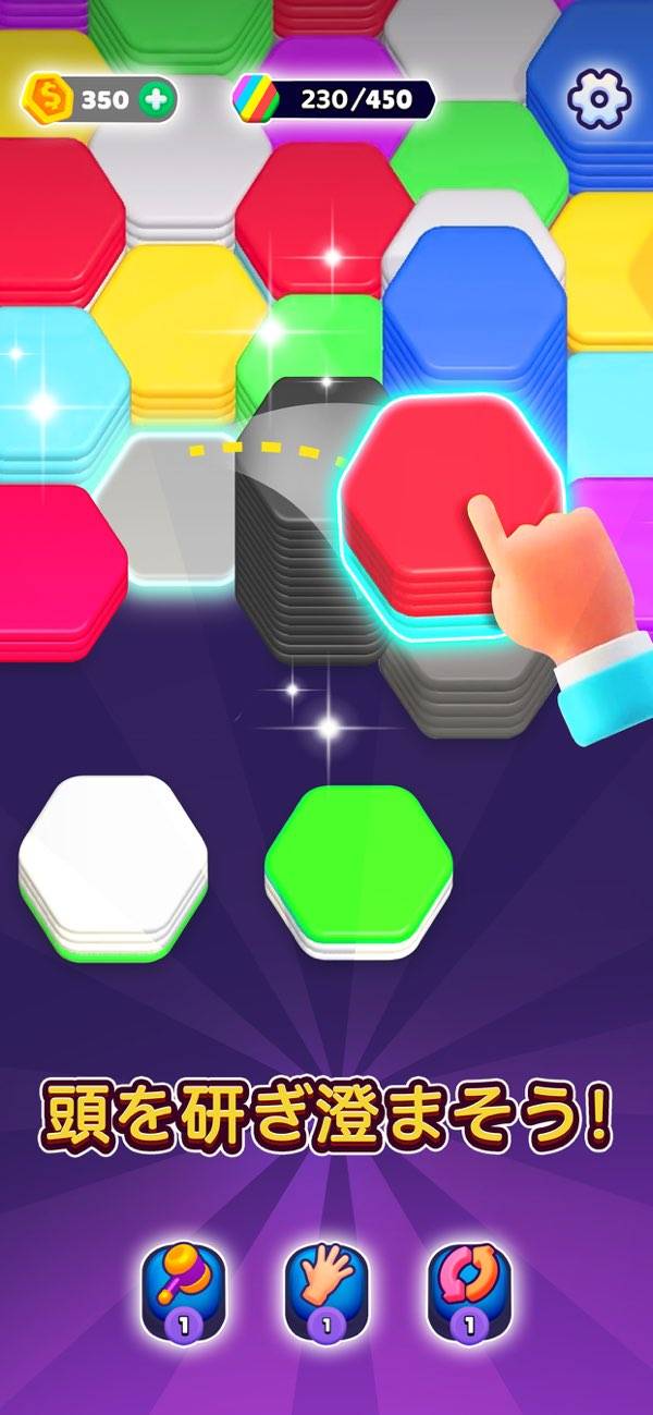 ランダムに現れる色とりどりのヘキサゴンをそろえるパズル。同じ色のヘキサゴンが隣接すると、パタパタとヘキサゴンが移動して1つの塊になります。一定の塊になると自動で消去され、その場所にまた新しいヘキサゴンが置ける仕組み。