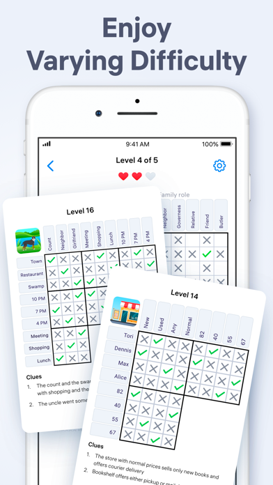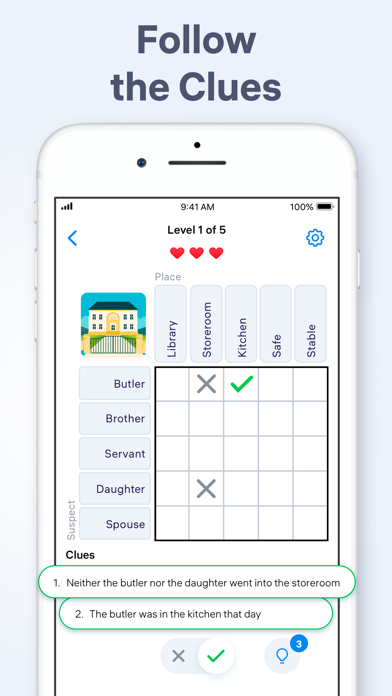 手がかりを読みながら、マス目にチェックorバツ印をつけるパズルゲーム。手がかりの中からロジック見つけていくので、まるで探偵になったような気分が味わえます。
