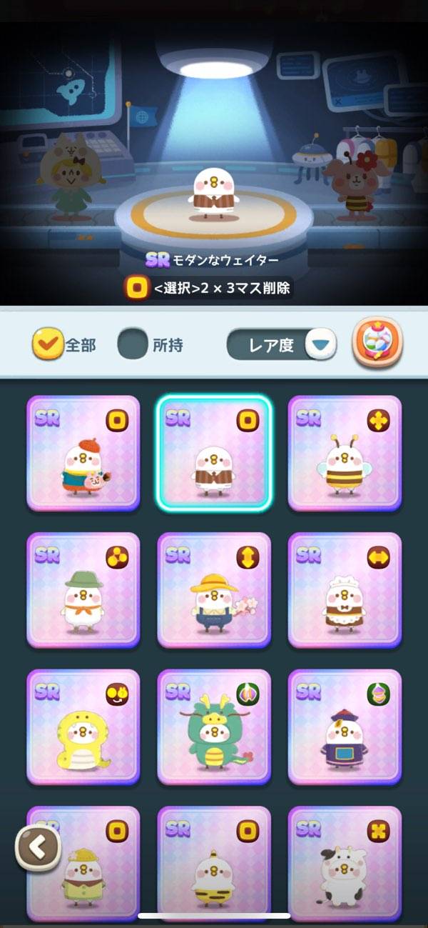 コスチュームを変えることで、パズル中に使用できるスキルが変化。指定したブロックを消したり、ランダムで一定範囲のブロックを消したりできます。