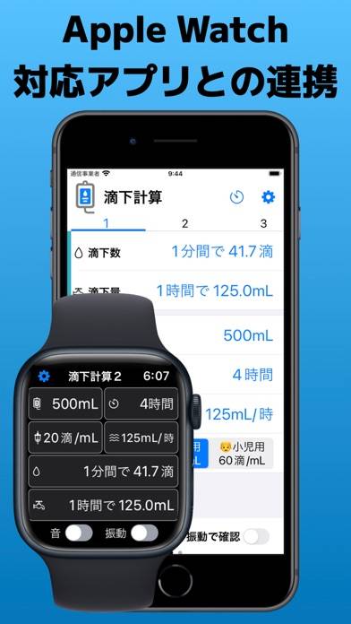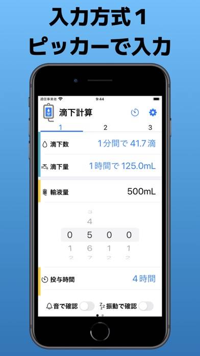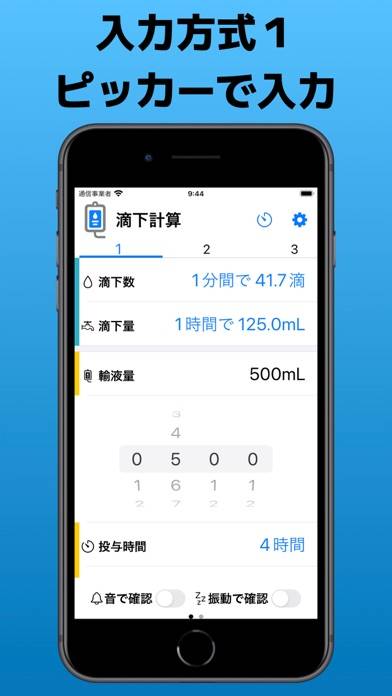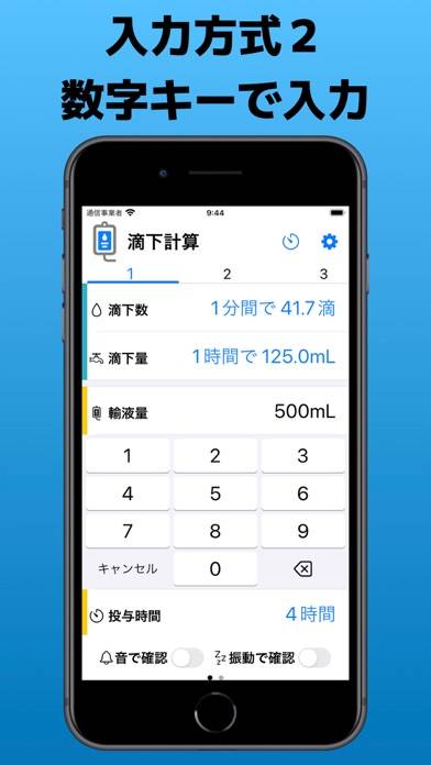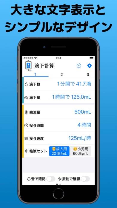 瞬時に最適な滴下数と滴下量を計算してくれるアプリです。輸液量、投与時間、輸液セットを入力するだけなので、看護師の負担を減らせます。各種設定は保存でき、複数のタイマーで管理しやすいのが魅力。確認音やバイブレーション、タイマー音といった細かい設定も可能です。