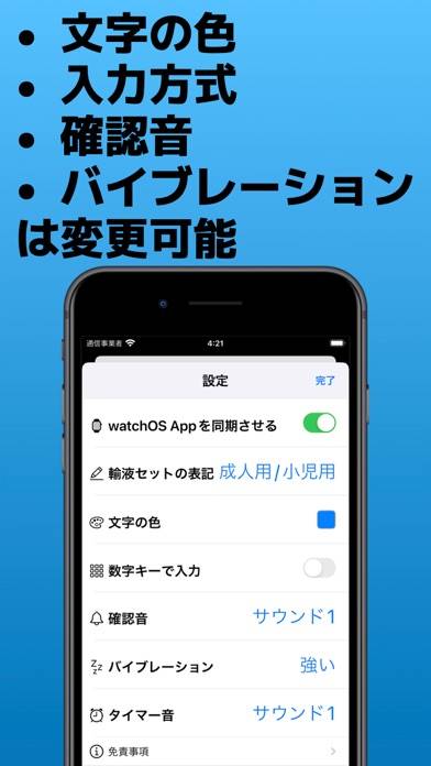 アプリ内の各種設定を細かく変更できるため、使いやすさを向上させられます。輸液セットの表記やタイマーの通知オン、音が出せない場面で便利なバイブレーションの強さまで、自分好みに設定可能です。
