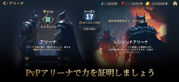 競争心をくすぐるアリーナでは、ほかのプレイヤーと戦えます。勝利を重ねていくと、ランクが上がっていくので上位を目指してみてください。上位を獲得するほど、良い報酬をもらえますよ。