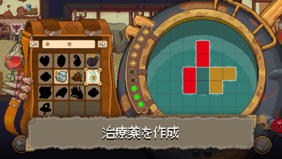 形の違う素材をマス目に当てはめて薬を調合していきます。ブロックパズルのようなプレイ感なのが魅力。作れる薬が増えるとブロックの形も複雑になっていき、頭を悩ませます。