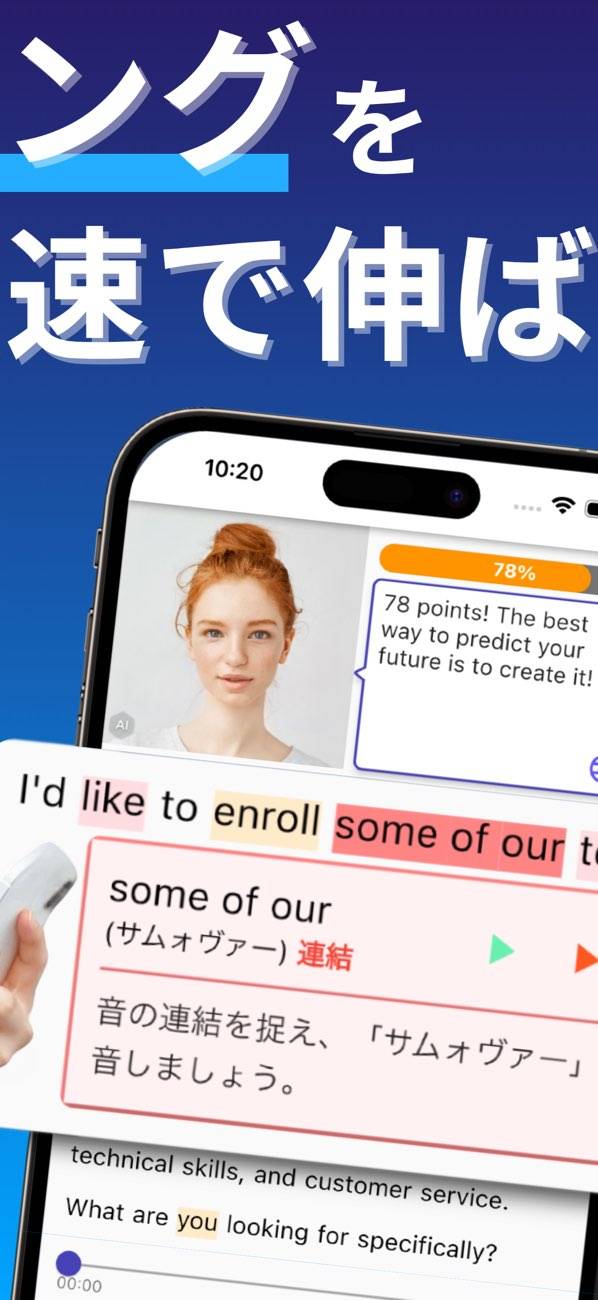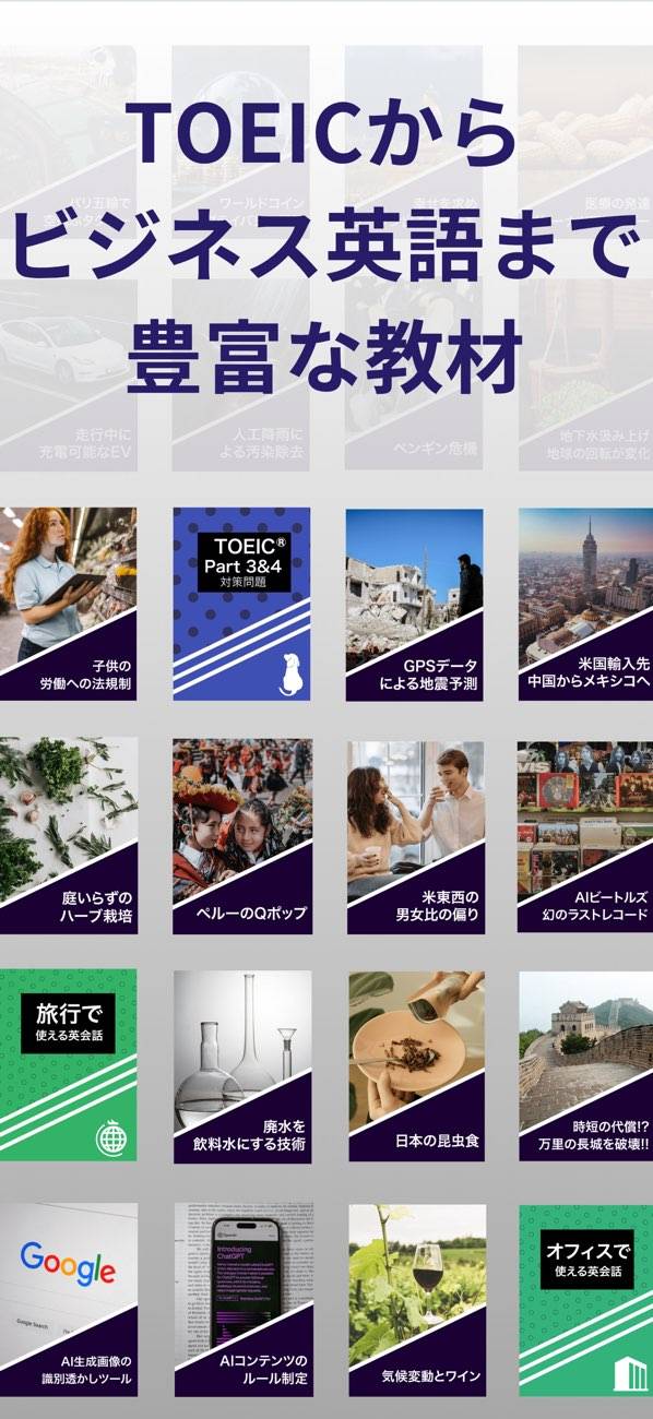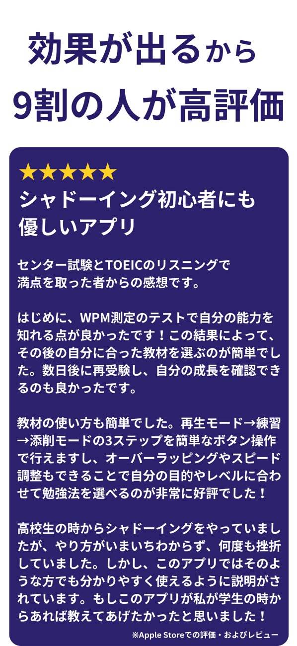 さまざまな例文を見ながらシャドーイング力を鍛えられるアプリ。400以上の教材が収録されており、TOEICや英検対策向けの教材も多数あります。