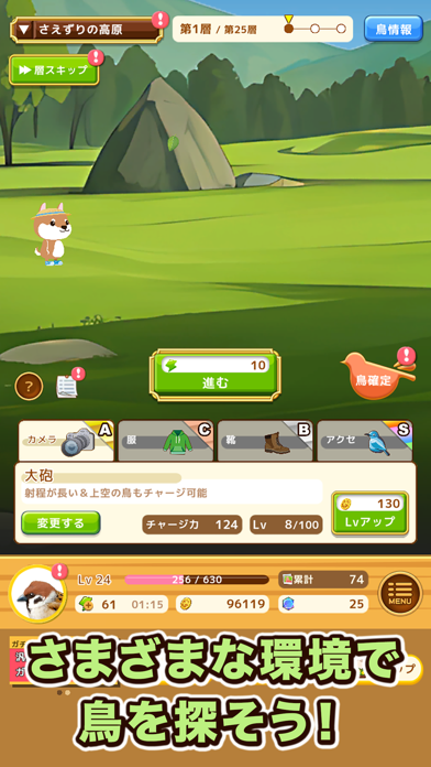 フィールドを探索して鳥を探しましょう。画面中央の「進む」をタップするとエネルギーが消費され、野鳥を探せます。野鳥に近づく、撮影する一連の流れは自動で行われるので、ほとんど見守るだけで遊べます。