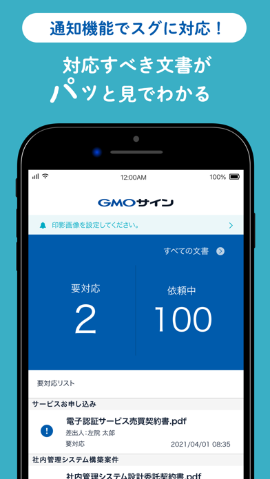重要な文書をクラウド上で管理し、電子署名も手軽に行えます。インターネットがあればいつでもどこでもアクセスができるため、オフィスにいなくてもOK。まずはアプリから印影の文字を設定してみてください。