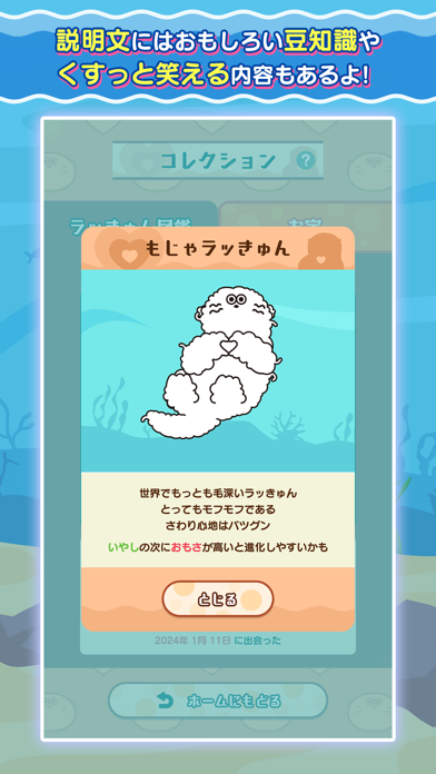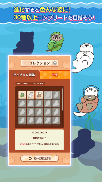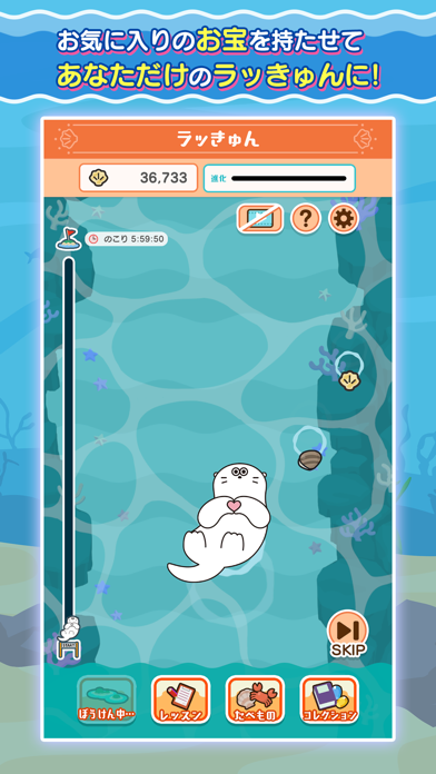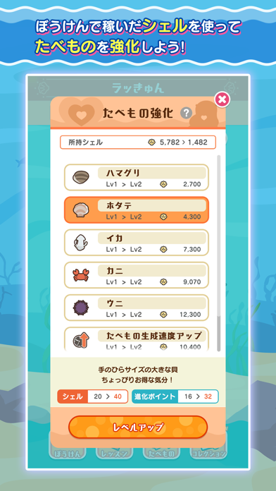 周りにただよっている貝やカニをタップすると、画面右上の進化ゲージがたまります。進化ゲージが満タンになるとラッきゅんの姿が変化。貝やカニは時間経過で徐々に現れるので、見つけたらすかさずタップしましょう。